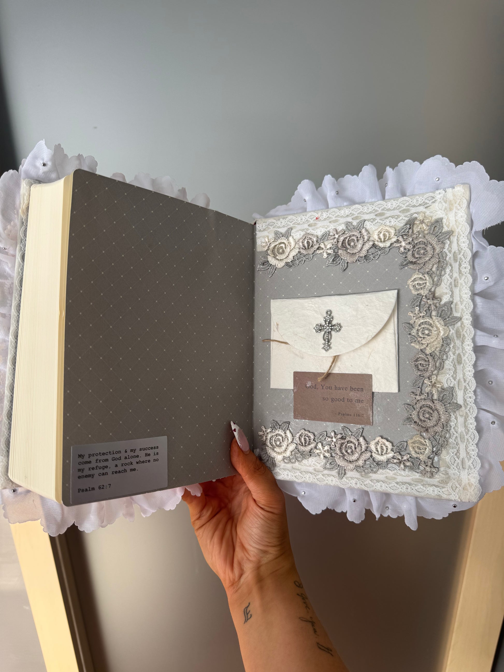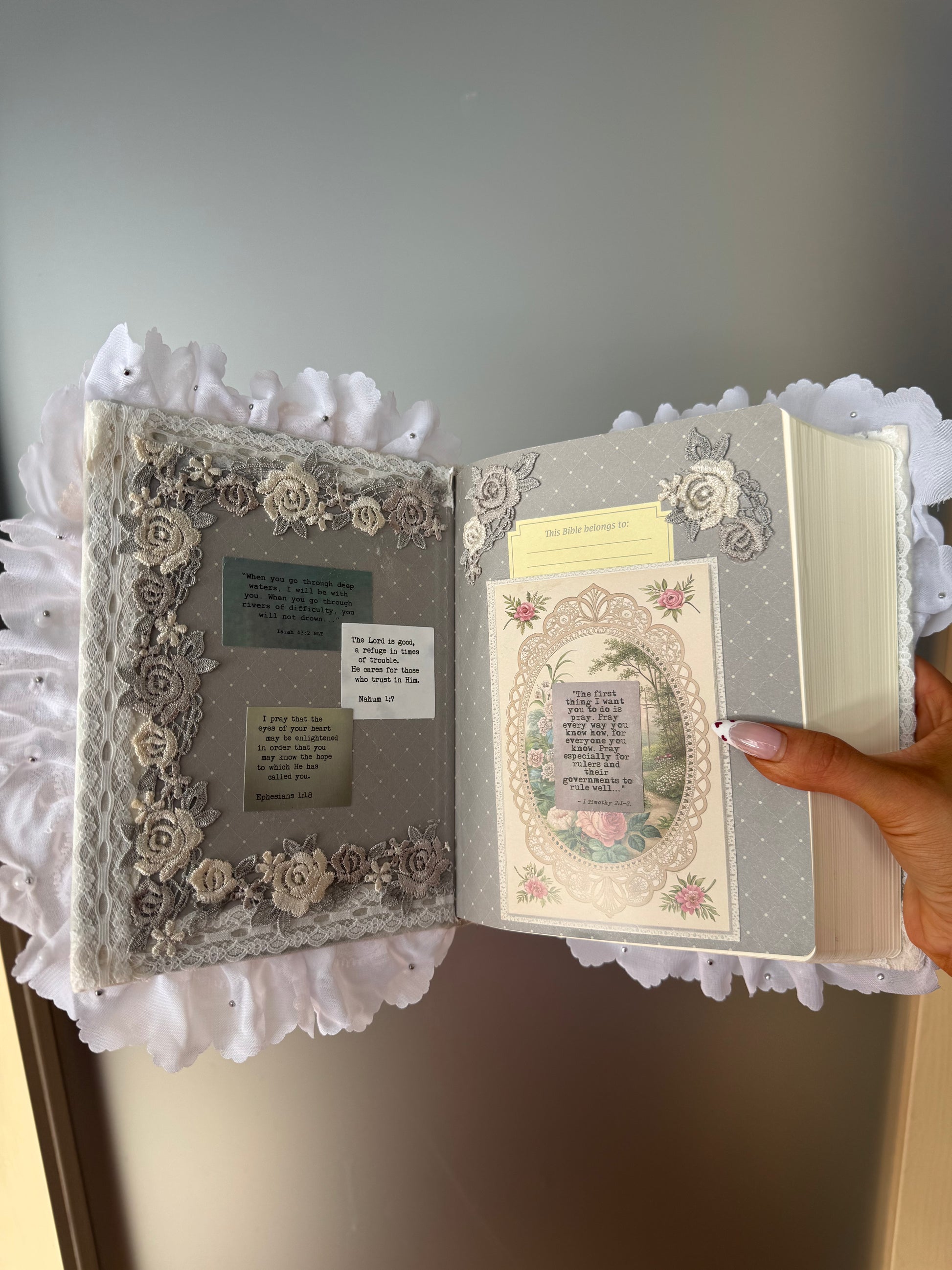 This one of a kind, study bible, that is fully functional with an elegant touch. From pearls to florals, golds, neutrals and lace. This bible is ready for you!